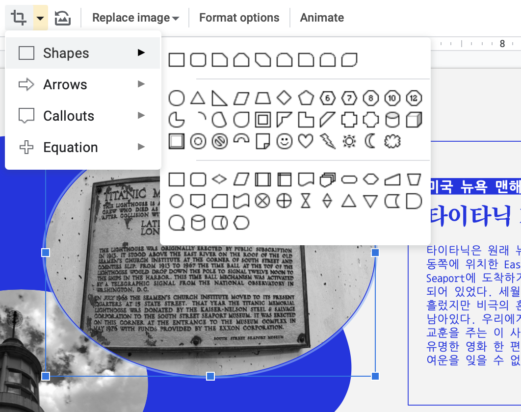 전체적으로 쿨한 컬러에 차가운 느낌이므로, 사진을 넣으실 때는 너무 네모네모하지 않게 동그랗게 넣어 주시는 것이 좋습니다. 동그랗게 자르는 방법은, 사진을 선택하신 뒤에 자르기 버튼 옆 조그만 아래 화살표를 눌러보시면, 다양한 모양으로 자를 수 있는 옵션들을 보실 수 있어요. 여기에서 원하는 모양을 선택하시면 그 모양으로 잘라집니다.