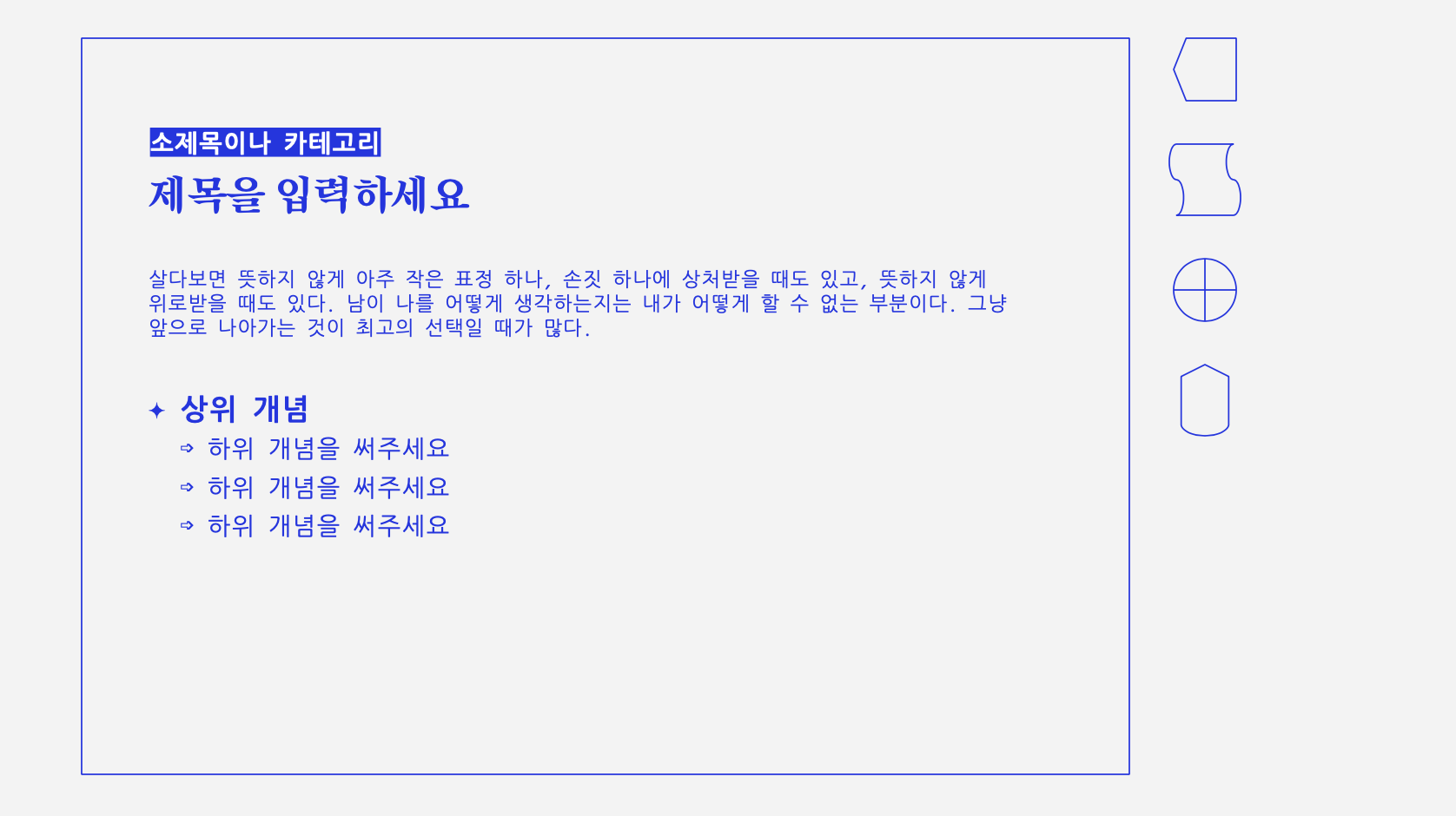 그냥 텍스트나 인용문구를 쓸 때에도 동그라미를 섞어서 활용해 주시면 좋습니다. 동그라미 속 내용과 네모 안의 내용은 서로 다른 레벨의 내용이라는 시그널을 줄 수 있죠.