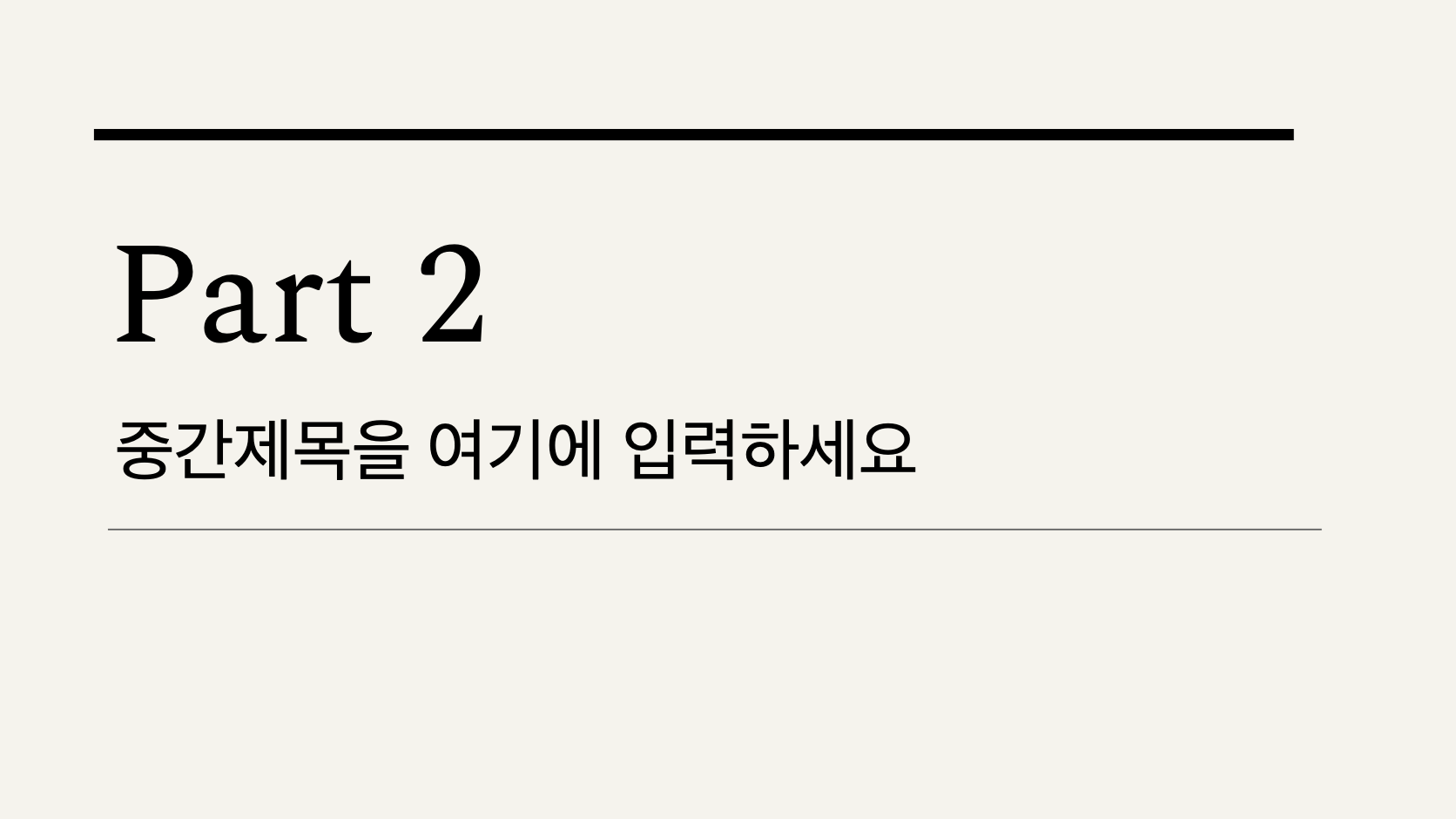 오늘은 구글슬라이드로 텍스트 위주의, 가장 기본적인 디자인으로 쓰실 수 있는 파워포인트 양식을 만들어 보았습니다. 차분하고, 장식이 없이 필수적인 요소만 갖춘 디자인이라 어떤 주제로 발표를 할 때 쓰든 잘 어울리는 템플릿입니다.