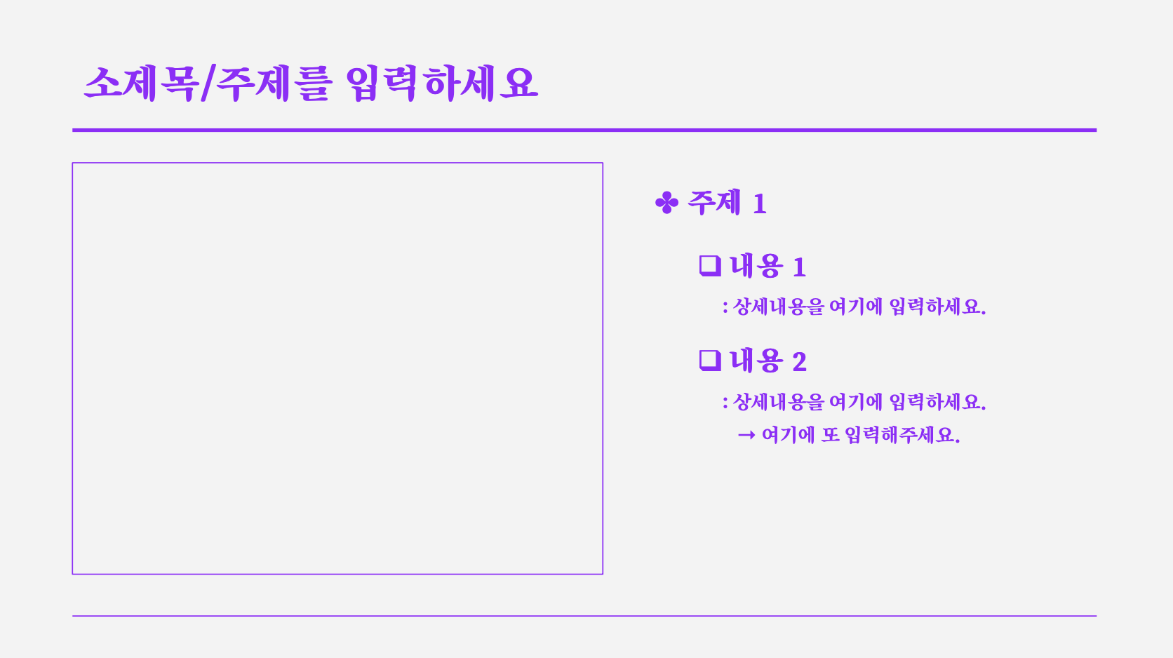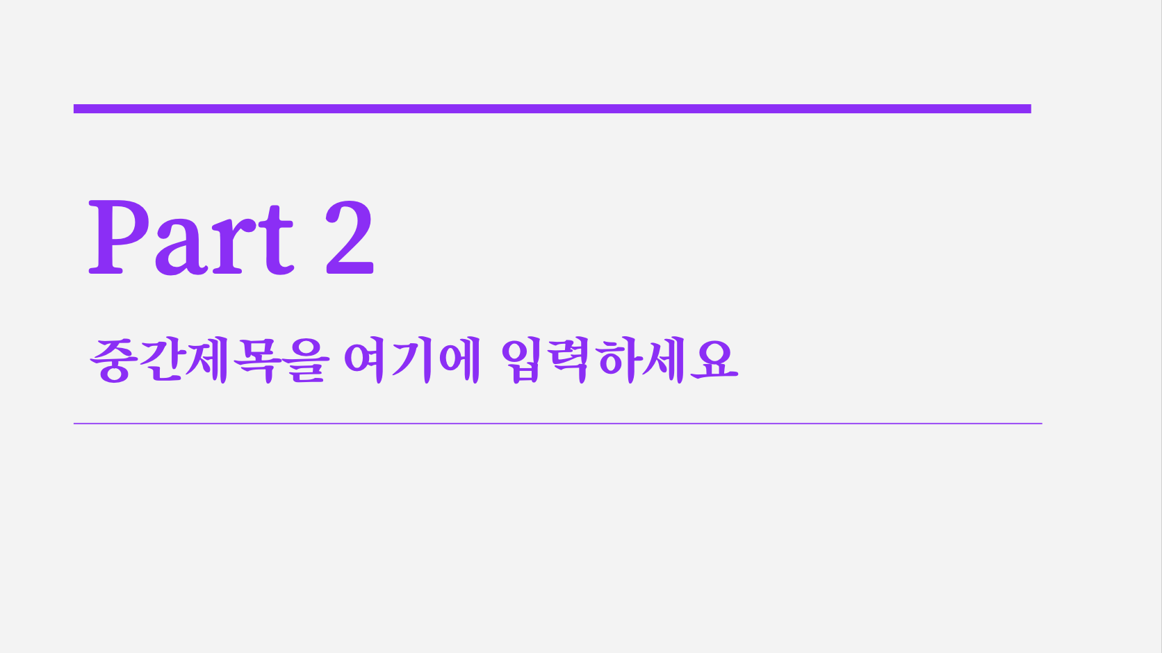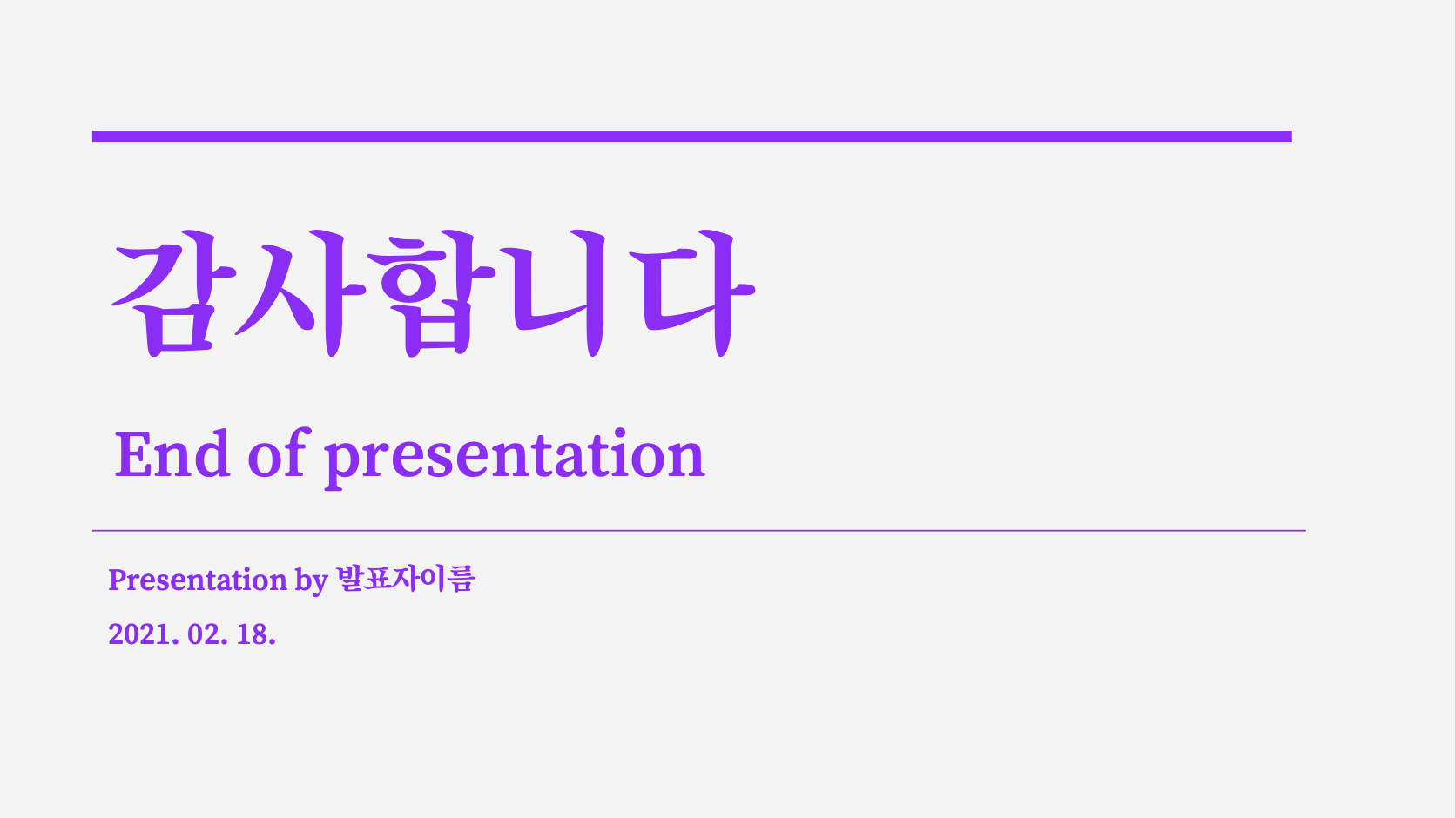은은한 회색의 바탕에 매우 튀는 보라색의 텍스트 (전체 송명체 사용)가 오버레이되어 튀는 느낌을 줍니다. 글자보다는 그림이 많은 슬라이드에 잘 어울립니다. 너무 글 많이 쓰지 않으실 때, 사진 위주로 쓱쓱 보고 넘어갈 때 활용하시기를 추천드려요.