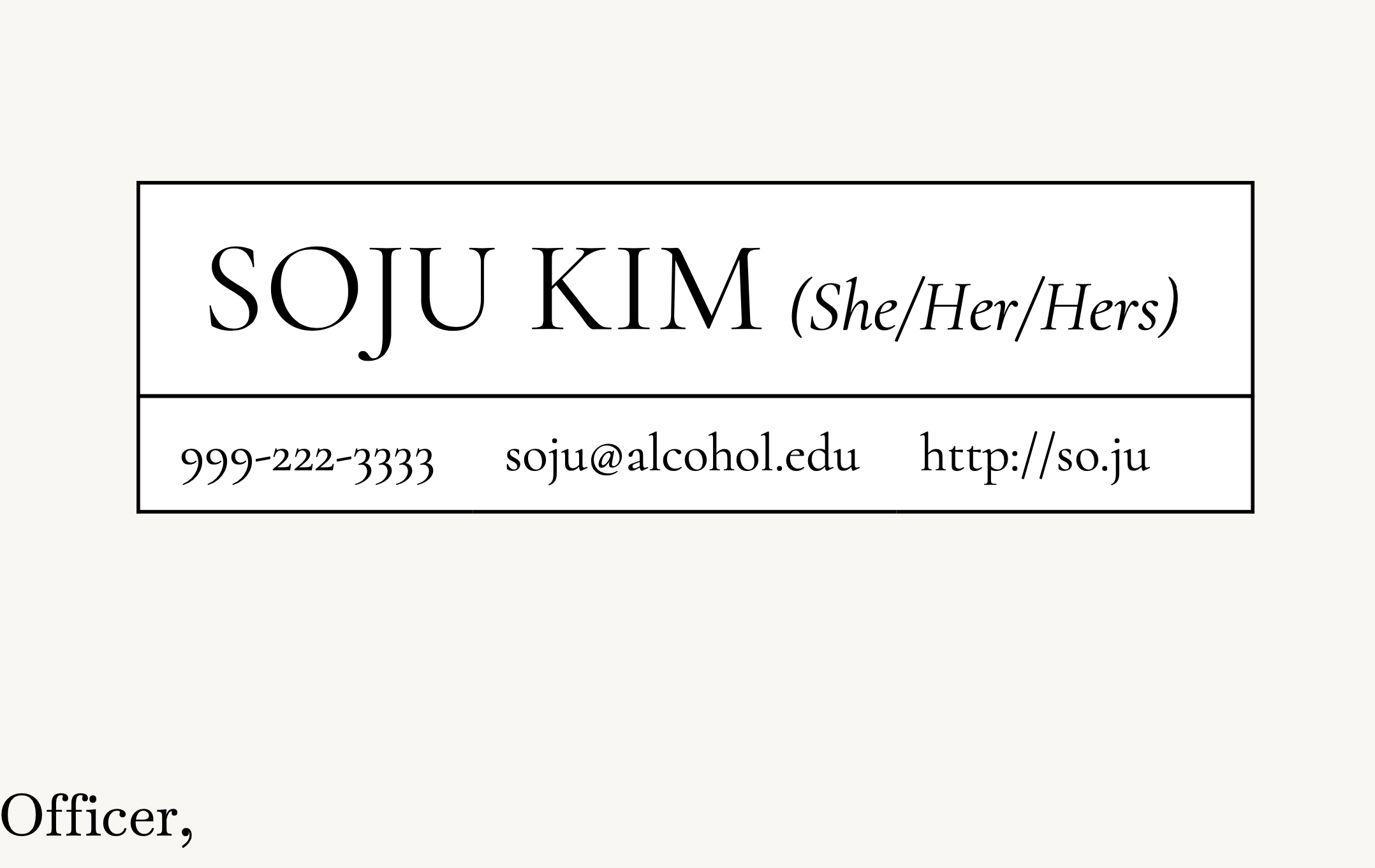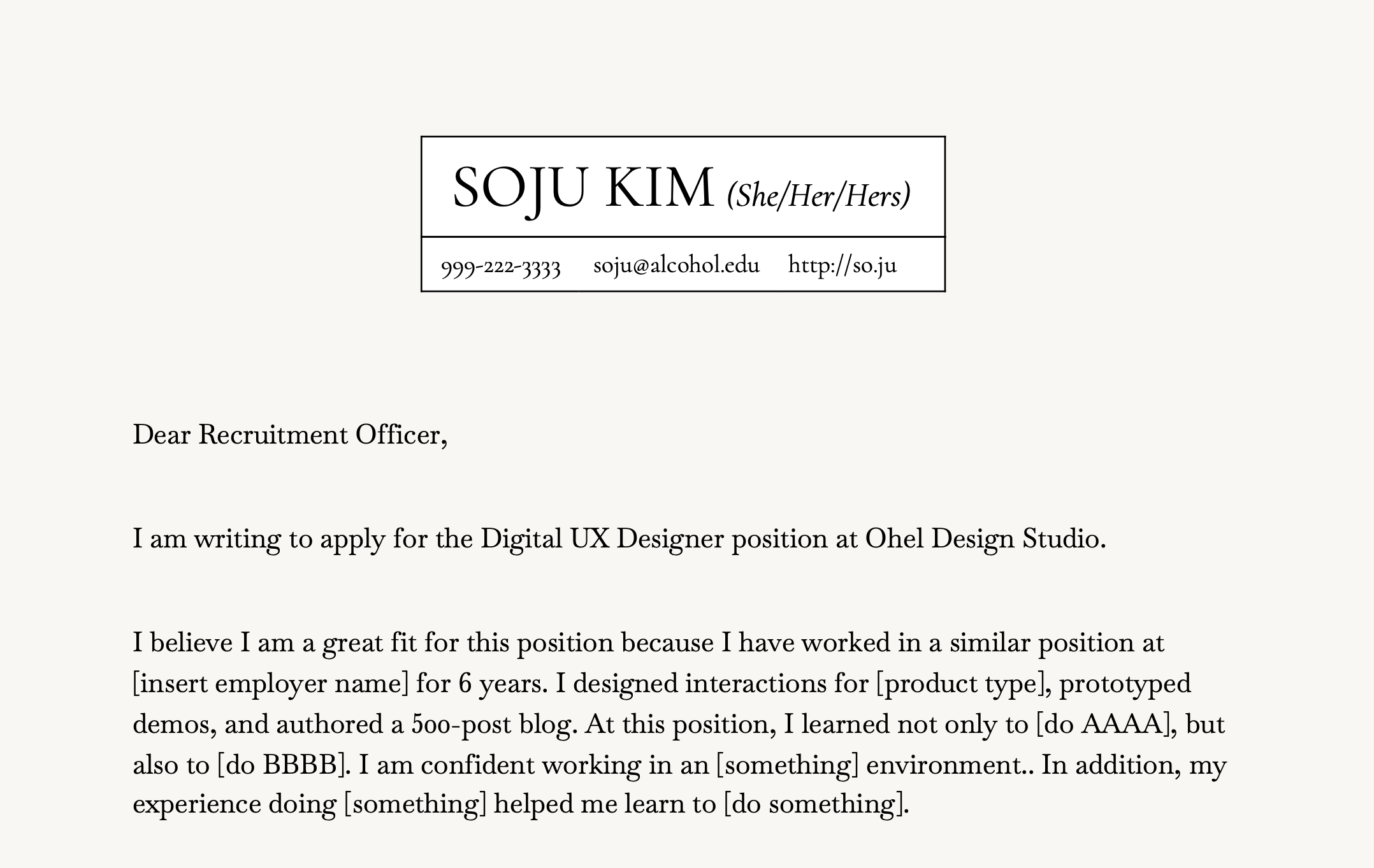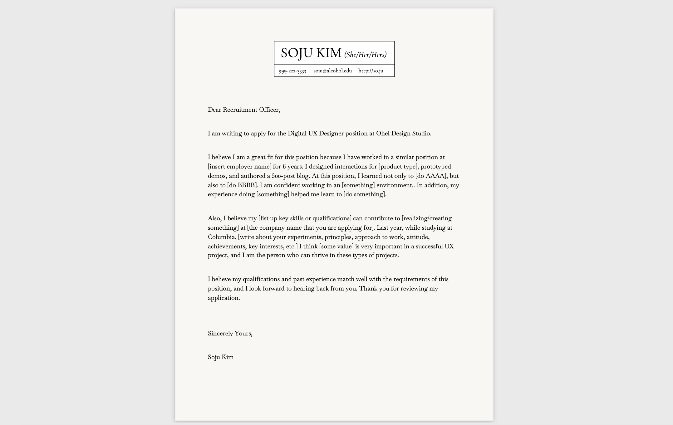 SOJU KIM (She/Her/Hers) 999-222-3333 soju@alcohol.edu http://so.ju Dear Recruitment Officer, I am writing to apply for the Digital UX Designer position at Ohel Design Studio. I believe I am a great fit for this position because I have worked in a similar p