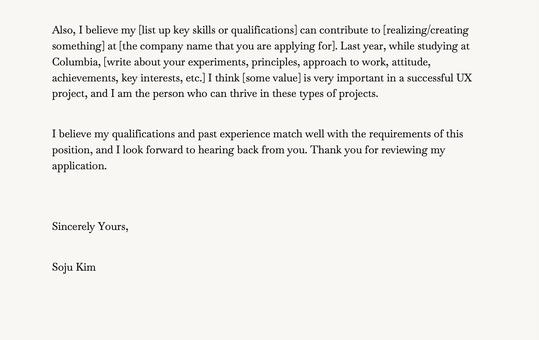 커버레터를 쓰고 꼭 주변에 가까운 친구나 가족에게 읽어봐 달라고 하면 좋아요. 막상 나쁜 피드백을 들으면 기분이 좀 그럴 수 있지만, 나중에 가서 생각해보면 늘 그들은 진실을 말해줬습니다. 얼마나 도움이 되는 지 몰라요.