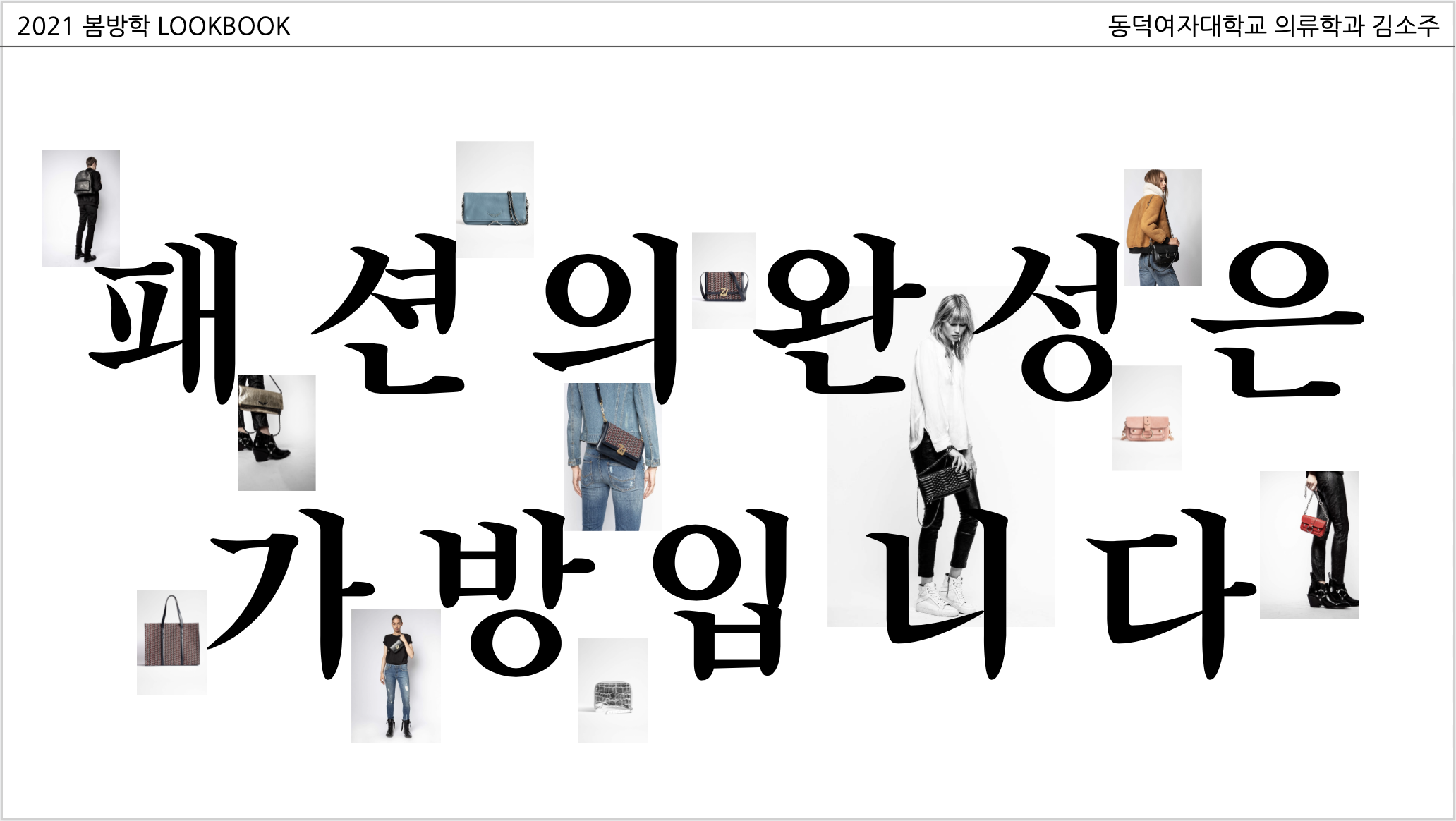 개인적으로 패션의 완성은 가방입니다 슬라이드가 가장 마음에 안 드네요. 너무 뭐가 많아서일까요... 저렇게 하면 안 된다는 예시로 한 번 봐주세요. 사진이 너무 많죠? 여러분은 가급적 사진을 너무 많이 넣지 말고, 적당한 양으로 사용하시면 좋겠어요. ^_^;;