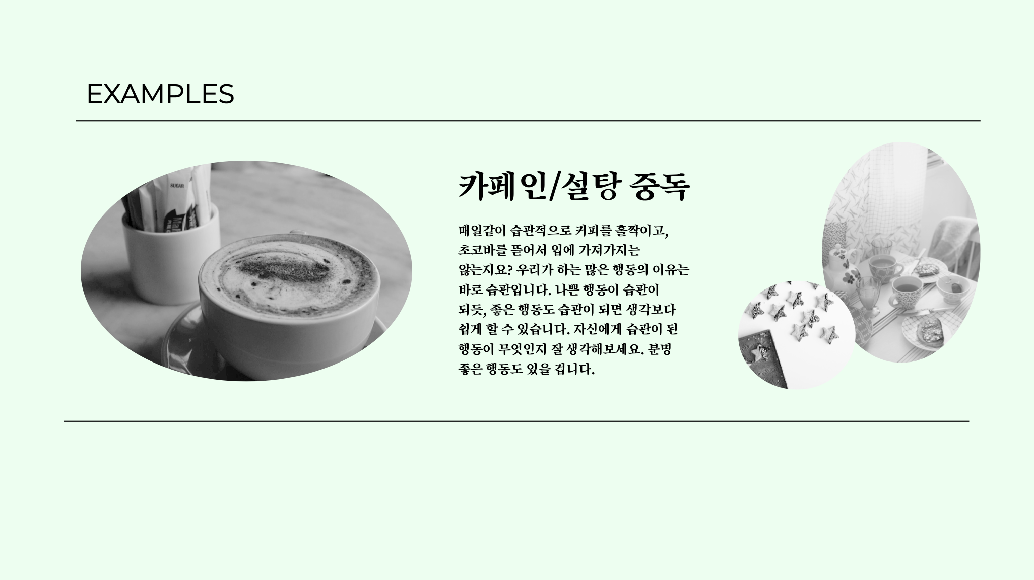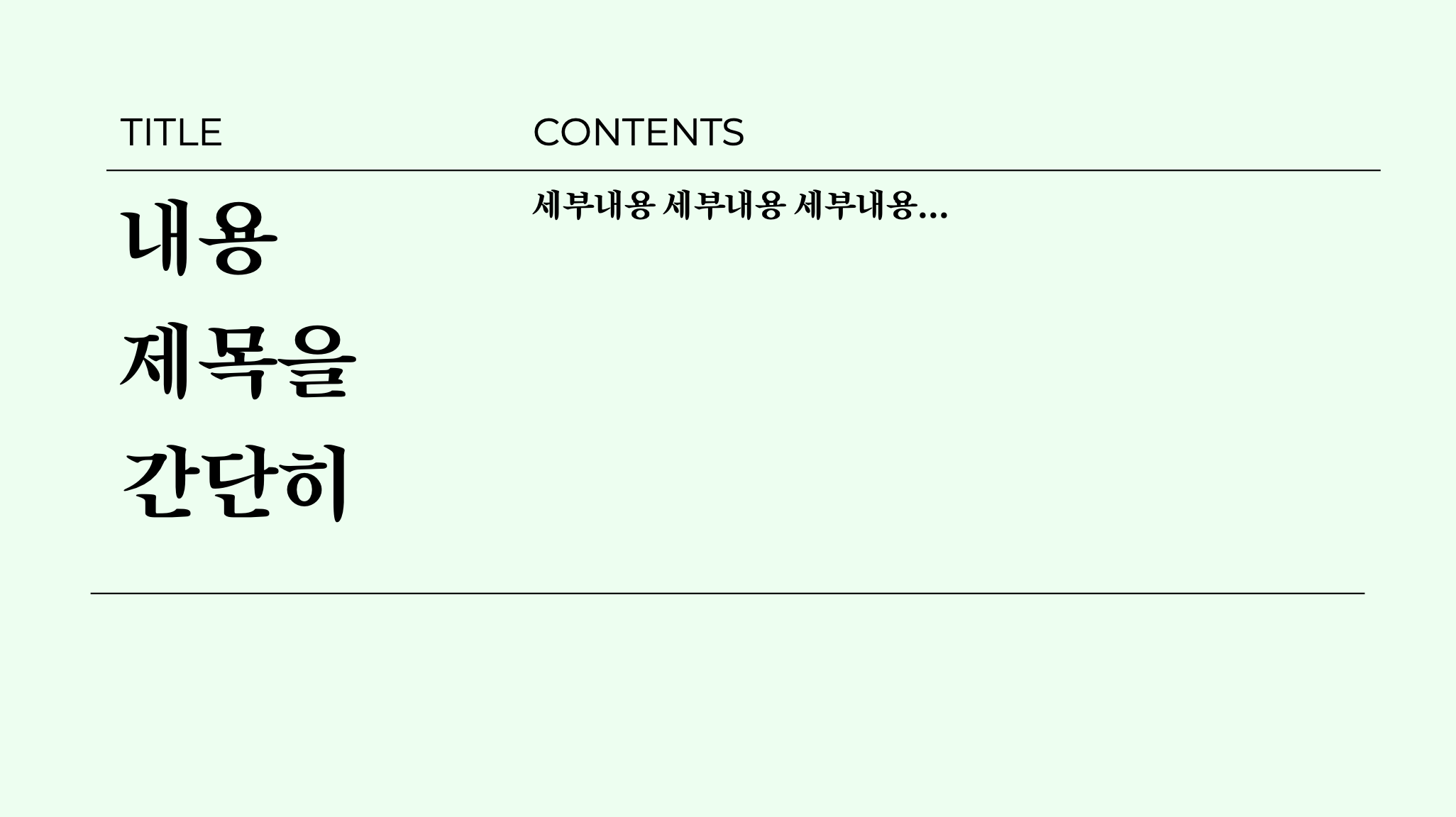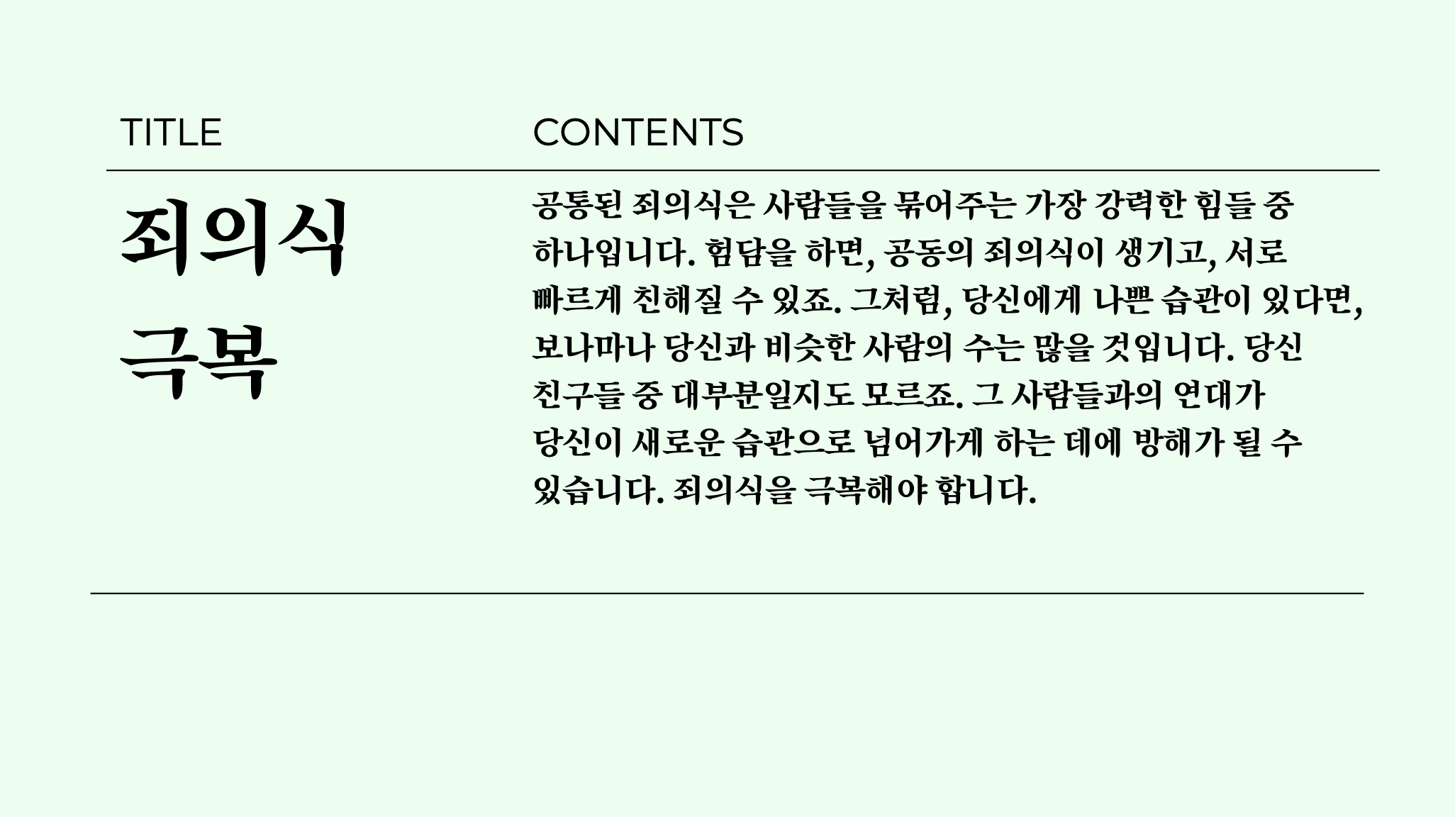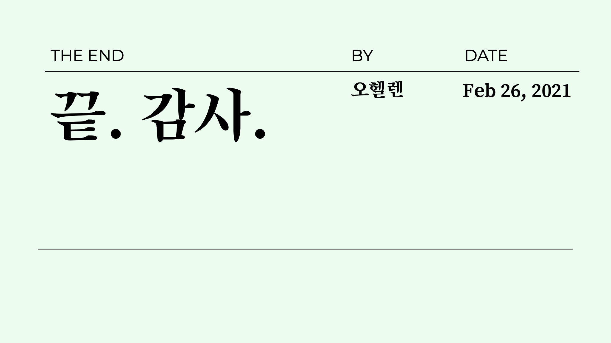 이번에는 너무 눈아프지 않게 적당히 상큼한 민트색 배경을 깔아줬구요, 텍스트는 완전한 블랙 컬러의 텍스트를 사용해서 가시성을 높여주었습니다. 사용된 폰트는 구글슬라이드에서 무료로 제공하는 Montserrat(영문), 송명체(한글)을 다시 사용했니다.